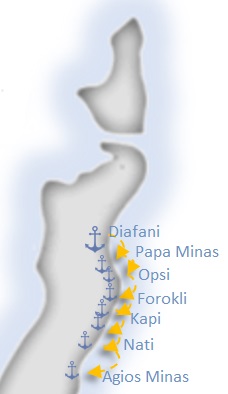 Νότια από το Διαφάνι υπάρχουν πολλές παραλίες από αυτές που μπορούμε να επισκεφτούμε. Ξεκινώντας από τον Παπά Μηνά και καταλήγοντας στον Άγιο Μηνά. Μερικές φορές, ανάλογα με τον καιρό και τη ζήτηση, φτάνουμε επίσης στην παραλία Apella.